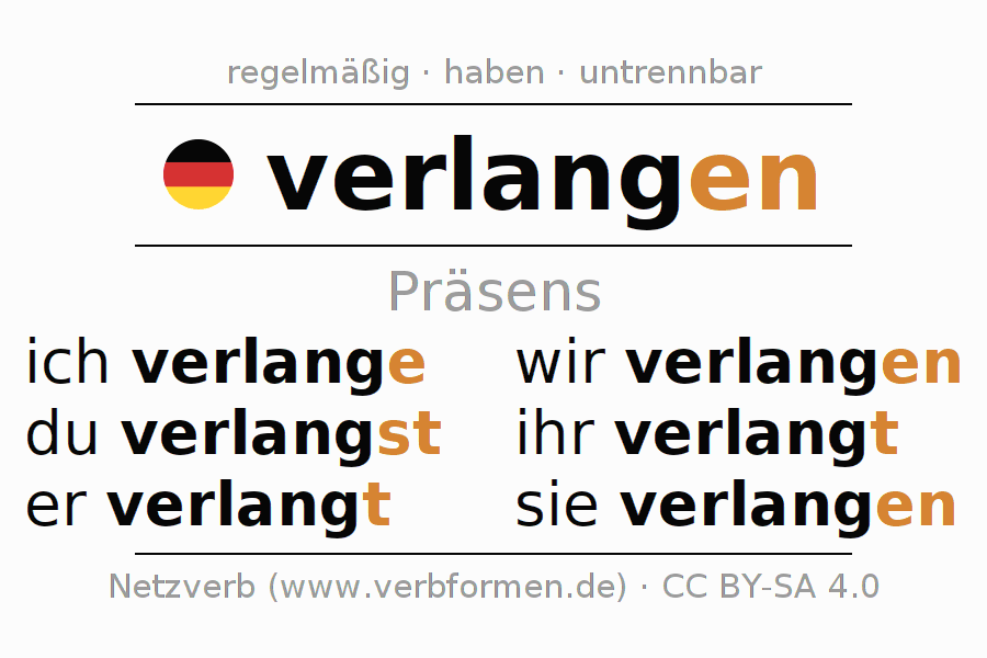 Das Verb verlangen vollständig in allen Personen und Numeri im Präsens Indikativ konjugiert