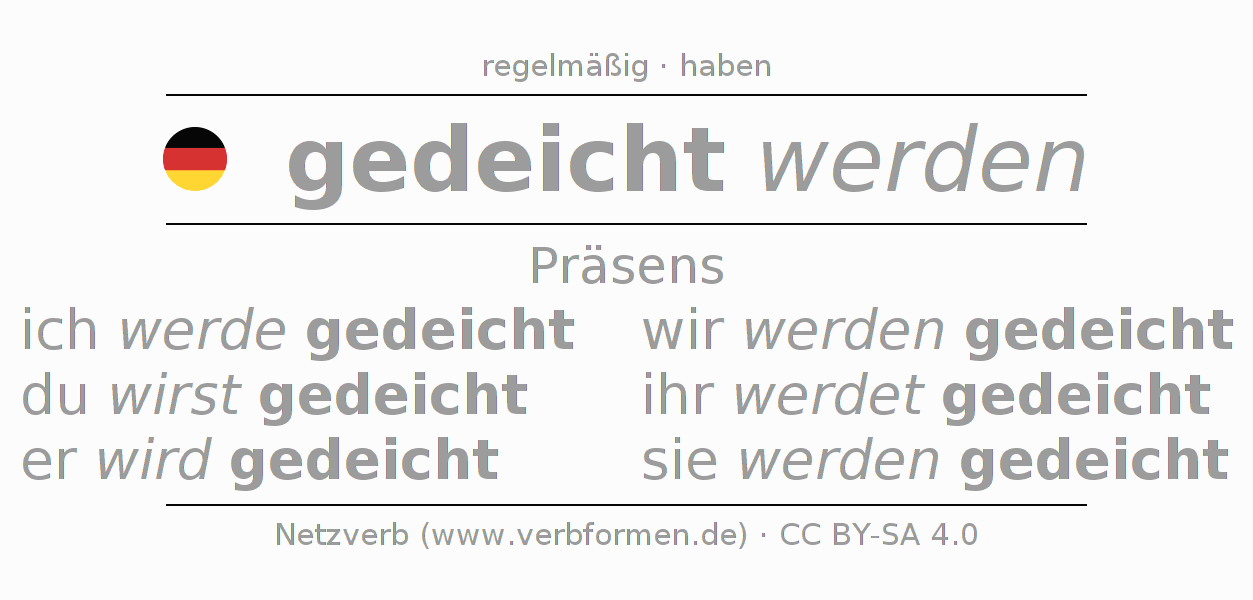 Das Verb deichen vollständig in allen Personen und Numeri im Präsens Indikativ konjugiert