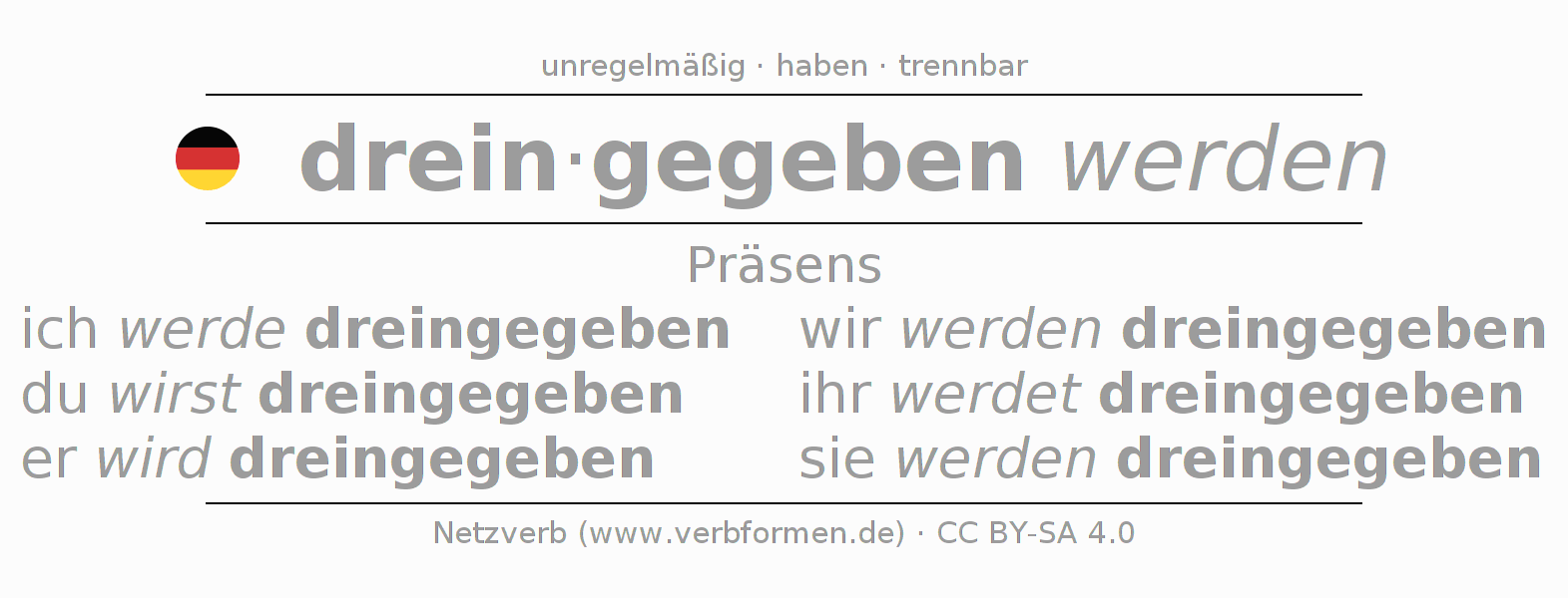 Das Verb dreingeben vollständig in allen Personen und Numeri im Präsens Indikativ konjugiert