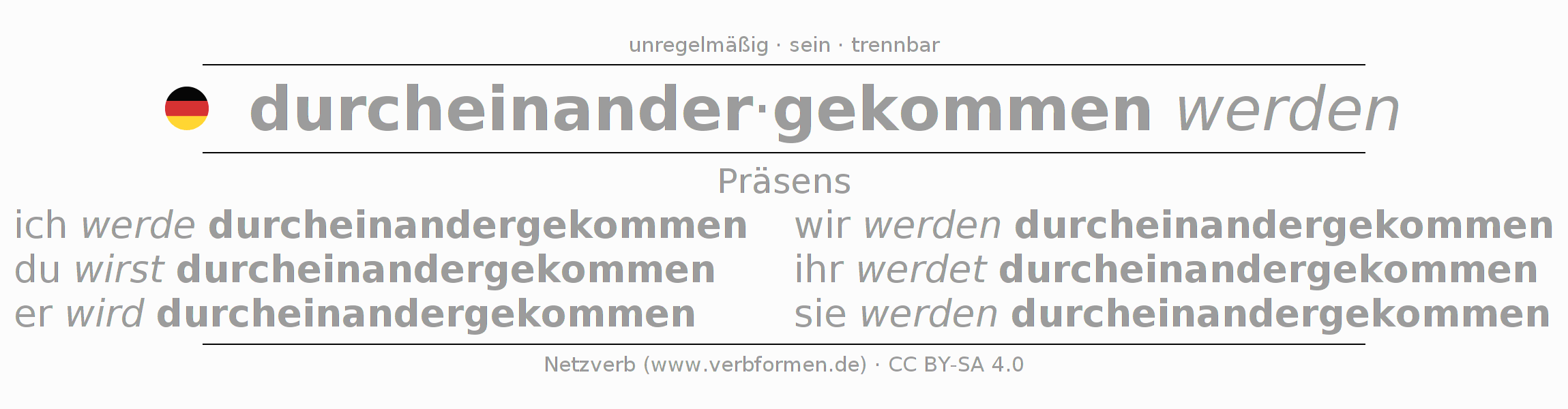 Das Verb durcheinanderkommen vollständig in allen Personen und Numeri im Präsens Indikativ konjugiert