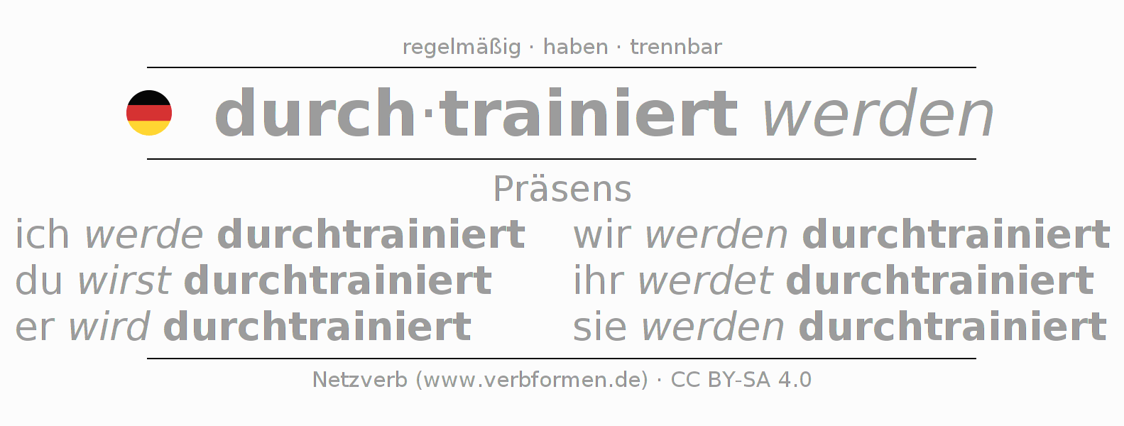Das Verb durchtrainieren vollständig in allen Personen und Numeri im Präsens Indikativ konjugiert