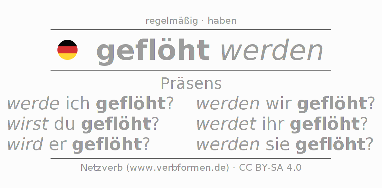 Die Konjugation von flöhen im Präsens Indikativ Gegenwart Vorgangspassiv ist: werde ich geflöht?, wirst du geflöht?, wird er geflöht?, werden wir geflöht?, werdet ihr geflöht?, werden sie geflöht?.Die Bildung dieser Formen entspricht gewissen grammatischen Regeln. So auch die Vorgaben zur Konjugation der einfachen Verbformen von flöhen im Präsens. Kommentare ☆