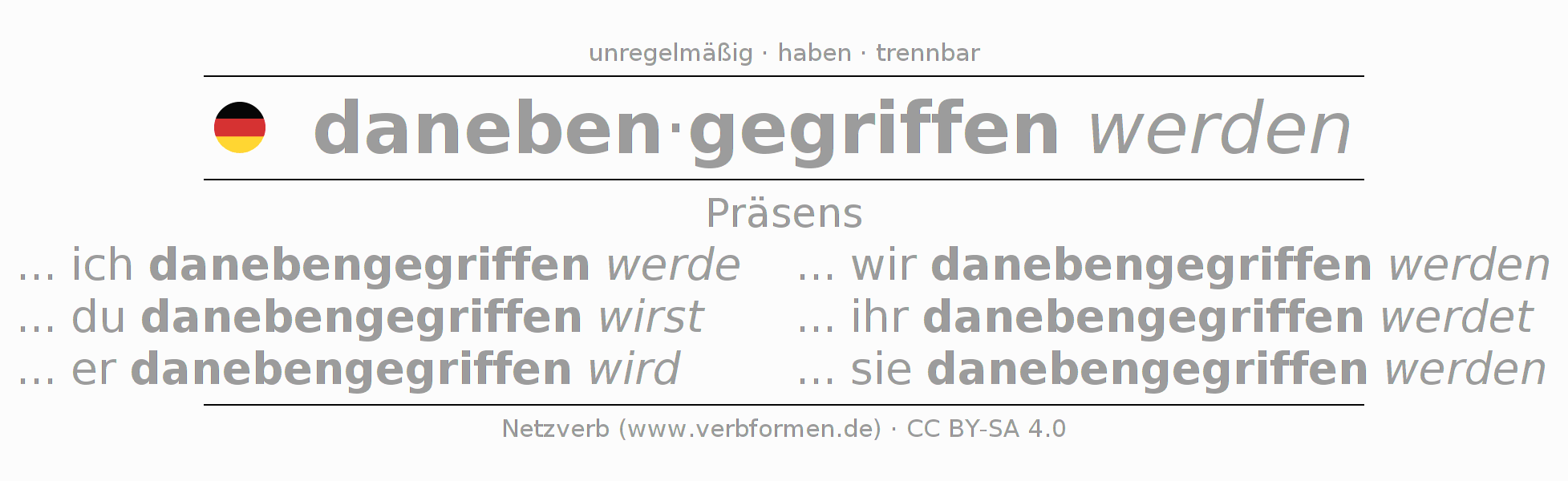 Das Verb danebengreifen vollständig in allen Personen und Numeri im Präsens Indikativ konjugiert