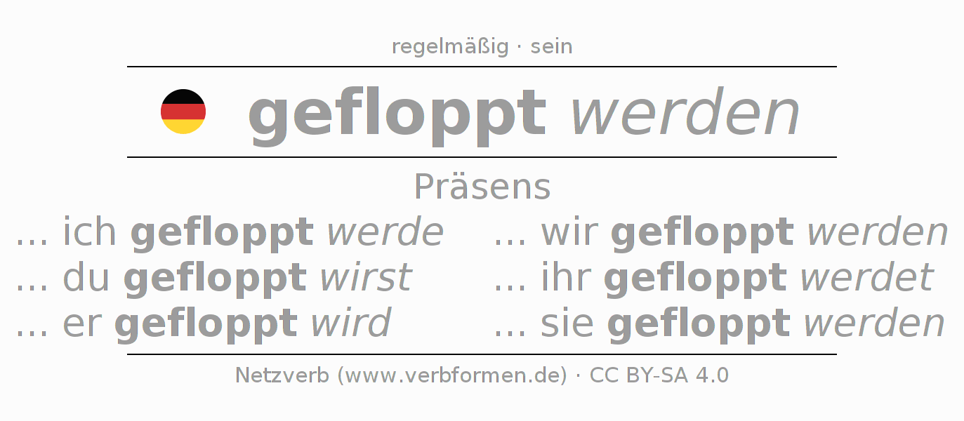 Das Verb floppen (ist) vollständig in allen Personen und Numeri im Präsens Indikativ konjugiert