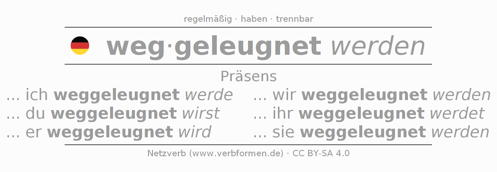 Das Verb wegleugnen vollständig in allen Personen und Numeri im Präsens Indikativ konjugiert