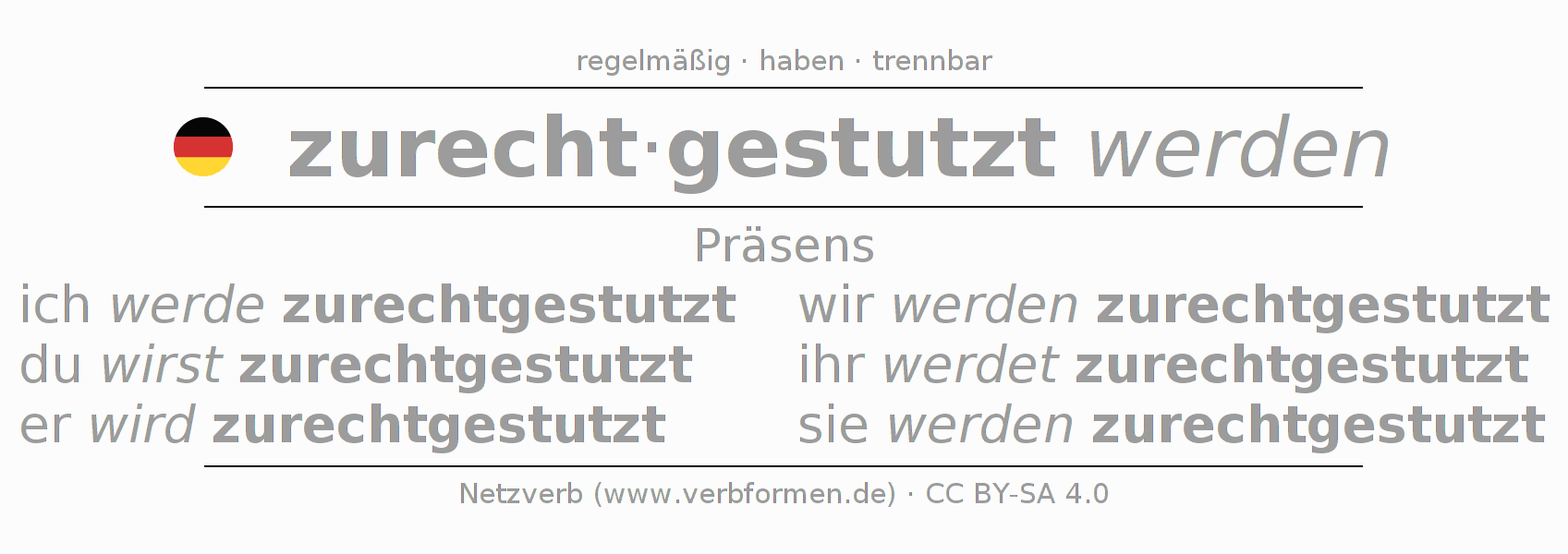 Die Konjugation von zurechtstutzen im Präsens Indikativ Gegenwart Vorgangspassiv ist: ich werde zurechtgestutzt, du wirst zurechtgestutzt, er wird zurechtgestutzt, wir werden zurechtgestutzt, ihr werdet zurechtgestutzt, sie werden zurechtgestutzt.Die Bildung dieser Formen entspricht gewissen grammatischen Regeln. So auch die Vorgaben zur Konjugation der einfachen Verbformen von zurechtstutzen im Präsens. Kommentare ☆