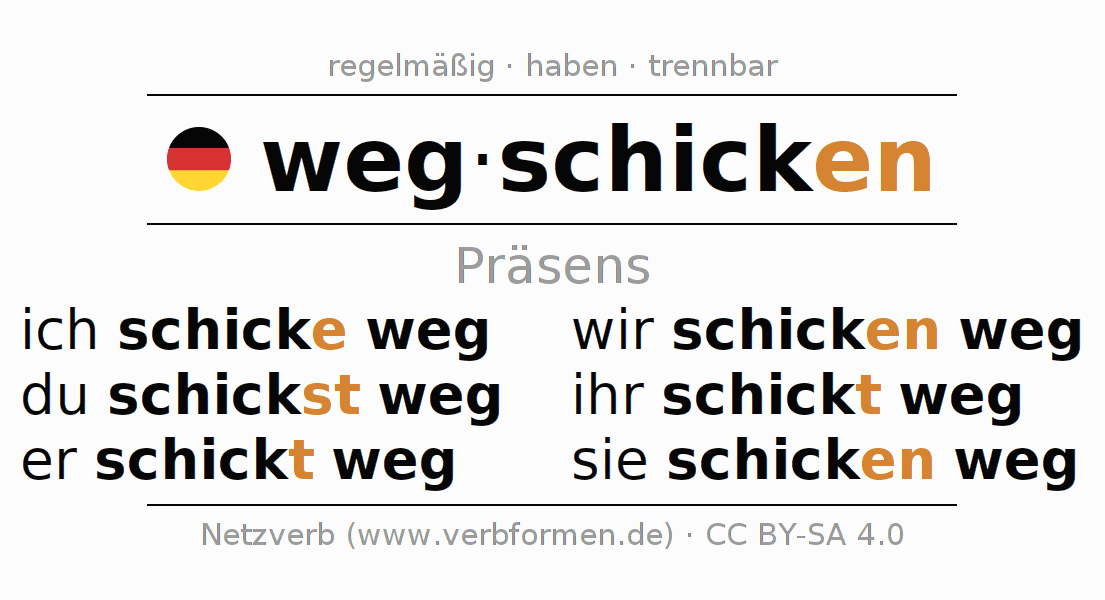 Das Verb wegschicken vollständig in allen Personen und Numeri im Präsens Indikativ konjugiert
