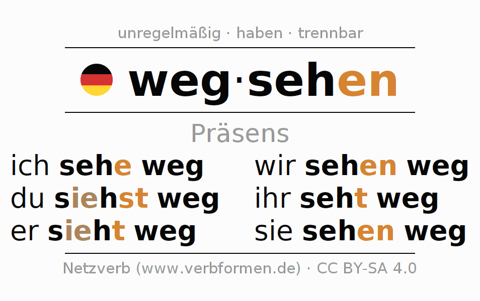 Das Verb wegsehen vollständig in allen Personen und Numeri im Präsens Indikativ konjugiert
