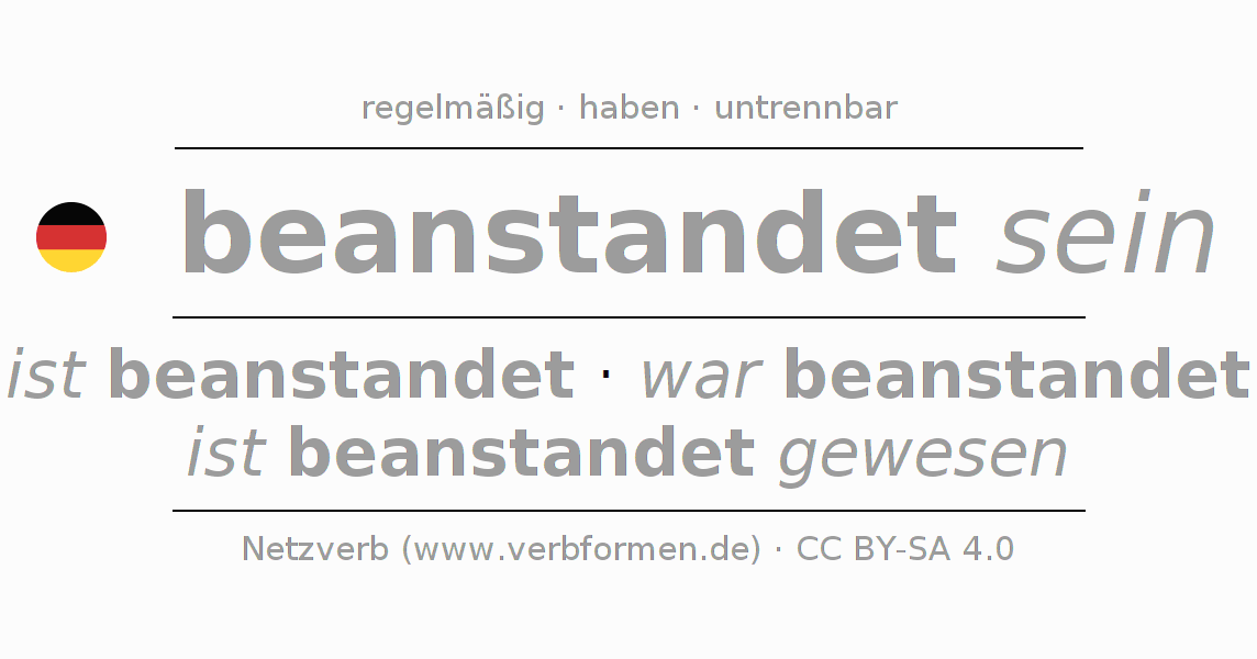 Die Konjugation von beanstanden im Präsens Indikativ Gegenwart Zustandspassiv ist: ich bin beanstandet, du bist beanstandet, er ist beanstandet, wir sind beanstandet, ihr seid beanstandet, sie sind beanstandet.Die Bildung dieser Formen entspricht gewissen grammatischen Regeln. So auch die Vorgaben zur Konjugation der einfachen Verbformen von beanstanden im Präsens. Kommentare ☆