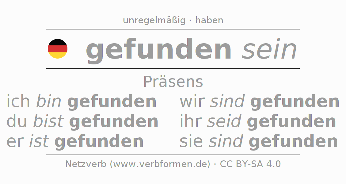 Die Konjugation von finden im Präsens Indikativ Gegenwart Zustandspassiv ist: ich bin gefunden, du bist gefunden, er ist gefunden, wir sind gefunden, ihr seid gefunden, sie sind gefunden.Die Bildung dieser Formen entspricht gewissen grammatischen Regeln. So auch die Vorgaben zur Konjugation der einfachen Verbformen von finden im Präsens. 10Kommentare ☆4.857143