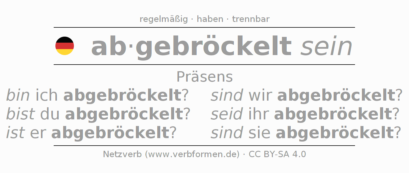 Das Verb abbröckeln (hat) vollständig in allen Personen und Numeri im Präsens Indikativ konjugiert