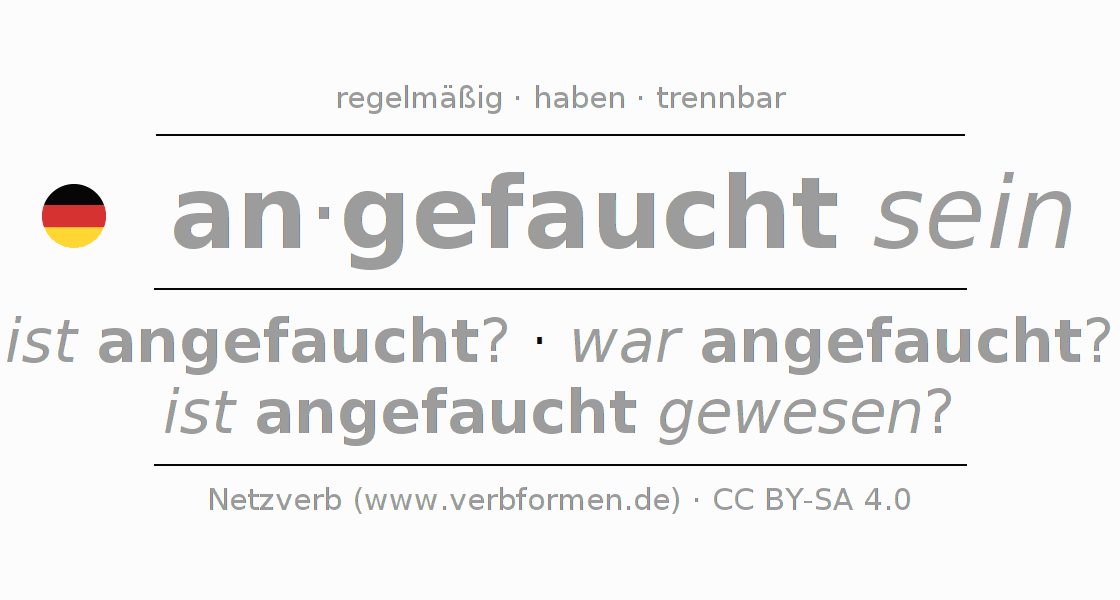 Die Konjugation von anfauchen im Präsens Indikativ Gegenwart Zustandspassiv ist: bin ich angefaucht?, bist du angefaucht?, ist er angefaucht?, sind wir angefaucht?, seid ihr angefaucht?, sind sie angefaucht?.Die Bildung dieser Formen entspricht gewissen grammatischen Regeln. So auch die Vorgaben zur Konjugation der einfachen Verbformen von anfauchen im Präsens. Kommentare ☆
