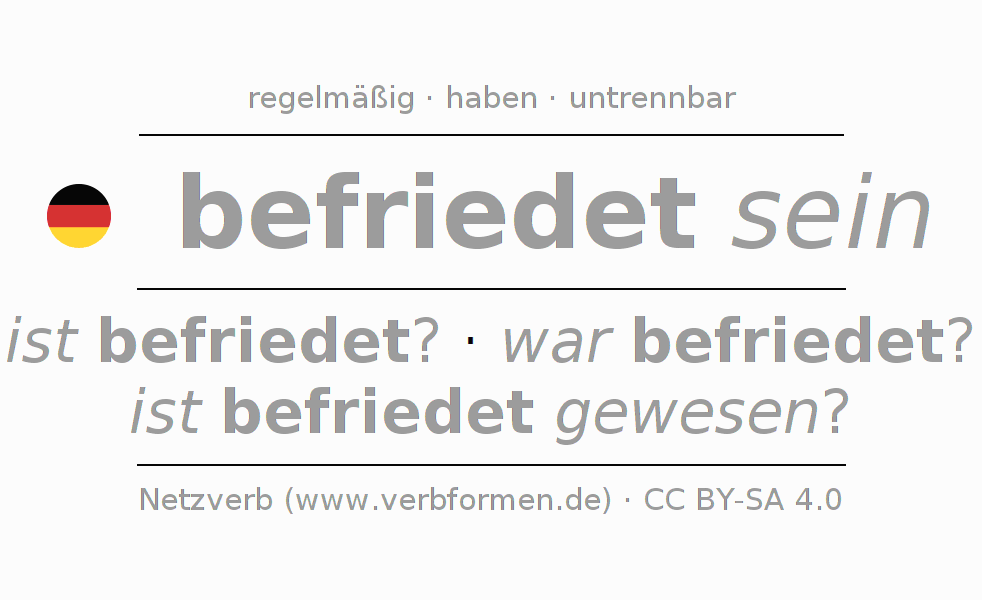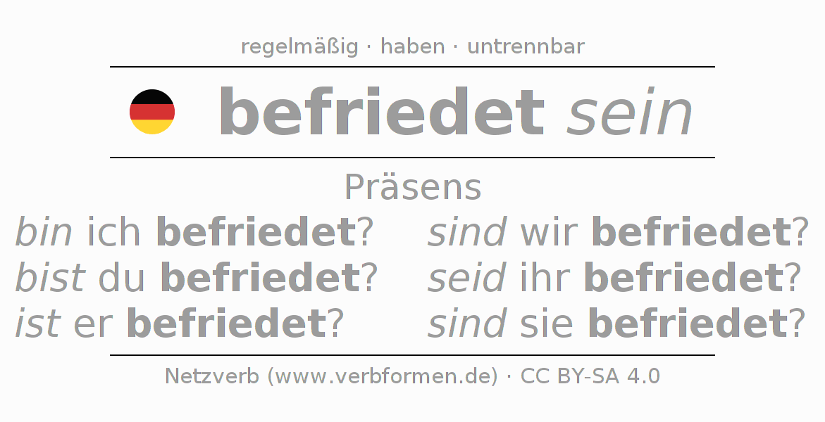 Die Konjugation von befrieden im Präsens Indikativ Gegenwart Zustandspassiv ist: bin ich befriedet?, bist du befriedet?, ist er befriedet?, sind wir befriedet?, seid ihr befriedet?, sind sie befriedet?.Die Bildung dieser Formen entspricht gewissen grammatischen Regeln. So auch die Vorgaben zur Konjugation der einfachen Verbformen von befrieden im Präsens. Kommentare ☆