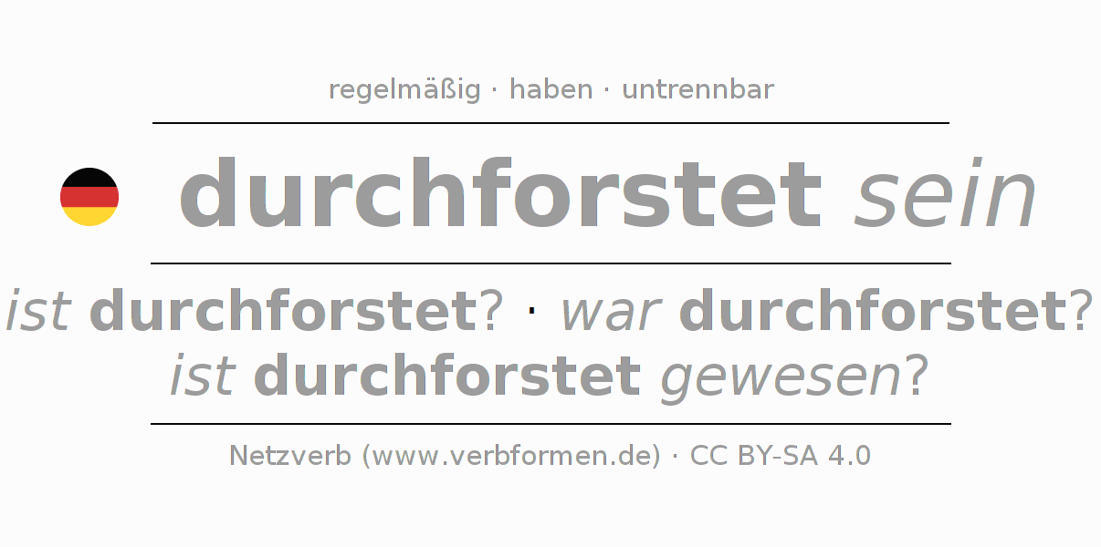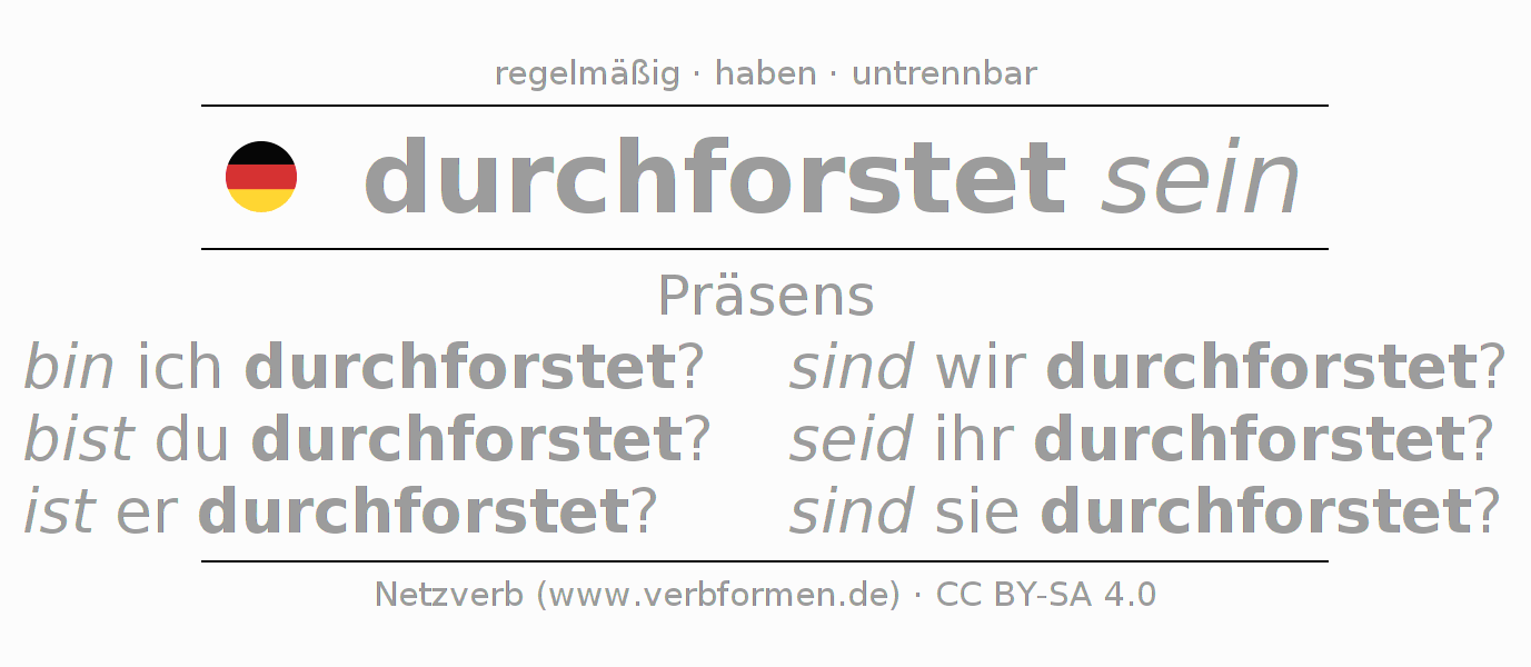 Die Konjugation von durchforsten im Präsens Indikativ Gegenwart Zustandspassiv ist: bin ich durchforstet?, bist du durchforstet?, ist er durchforstet?, sind wir durchforstet?, seid ihr durchforstet?, sind sie durchforstet?.Die Bildung dieser Formen entspricht gewissen grammatischen Regeln. So auch die Vorgaben zur Konjugation der einfachen Verbformen von durchforsten im Präsens. Kommentare ☆