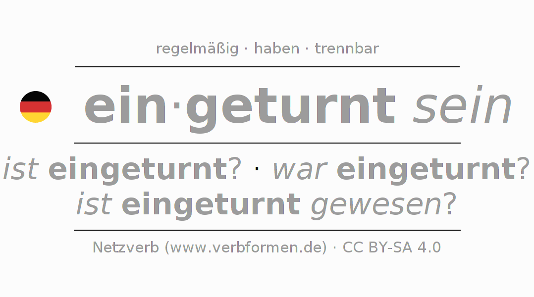 Die Konjugation von einturnen im Präsens Indikativ Gegenwart Zustandspassiv ist: bin ich eingeturnt?, bist du eingeturnt?, ist er eingeturnt?, sind wir eingeturnt?, seid ihr eingeturnt?, sind sie eingeturnt?.Die Bildung dieser Formen entspricht gewissen grammatischen Regeln. So auch die Vorgaben zur Konjugation der einfachen Verbformen von einturnen im Präsens. Kommentare ☆