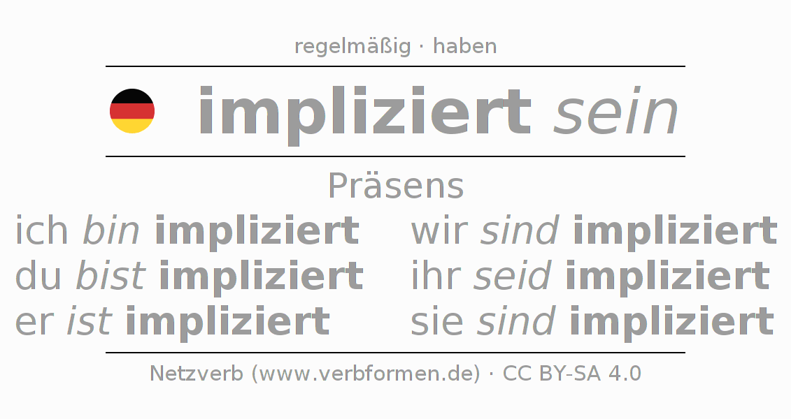 Das Verb implizieren vollständig in allen Personen und Numeri im Präsens Indikativ konjugiert