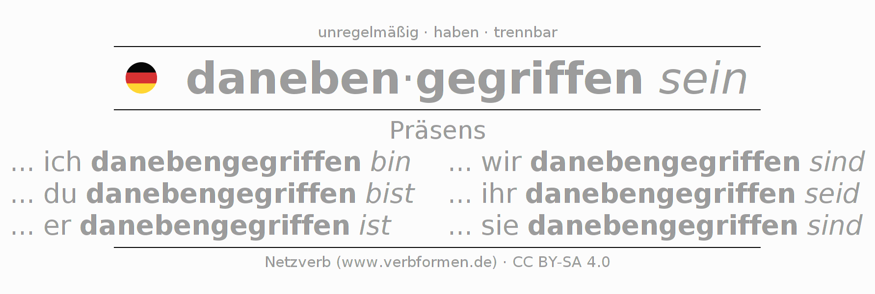 Das Verb danebengreifen vollständig in allen Personen und Numeri im Präsens Indikativ konjugiert