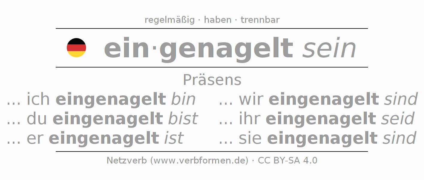 Die Konjugation von einnageln im Präsens Indikativ Gegenwart Zustandspassiv ist: ... ich eingenagelt bin, ... du eingenagelt bist, ... er eingenagelt ist, ... wir eingenagelt sind, ... ihr eingenagelt seid, ... sie eingenagelt sind.Die Bildung dieser Formen entspricht gewissen grammatischen Regeln. So auch die Vorgaben zur Konjugation der einfachen Verbformen von einnageln im Präsens. Kommentare ☆