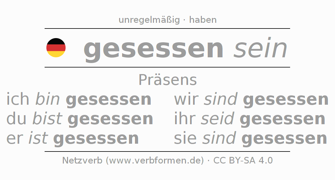 Die Konjugation von sitzen im Präsens Indikativ Gegenwart Zustandspassiv ist: ich bin gesessen, du bist gesessen, er ist gesessen, wir sind gesessen, ihr seid gesessen, sie sind gesessen.Die Bildung dieser Formen entspricht gewissen grammatischen Regeln. So auch die Vorgaben zur Konjugation der einfachen Verbformen von sitzen im Präsens. 10Kommentare ☆4.6666665