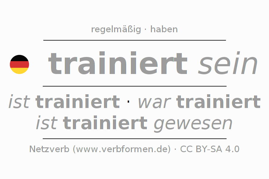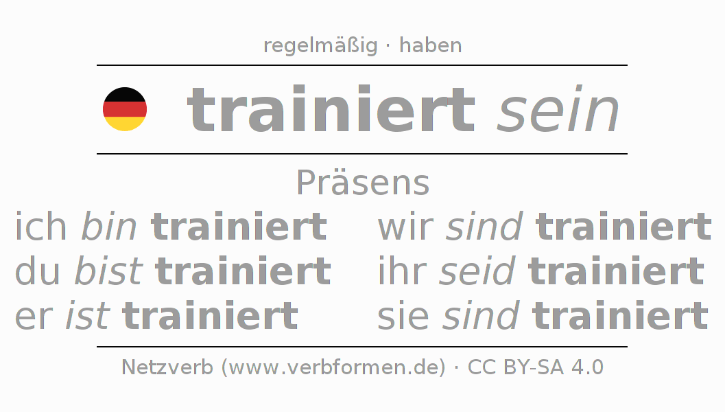 Die Konjugation von trainieren im Präsens Indikativ Gegenwart Zustandspassiv ist: ich bin trainiert, du bist trainiert, er ist trainiert, wir sind trainiert, ihr seid trainiert, sie sind trainiert.Die Bildung dieser Formen entspricht gewissen grammatischen Regeln. So auch die Vorgaben zur Konjugation der einfachen Verbformen von trainieren im Präsens. Kommentare ☆