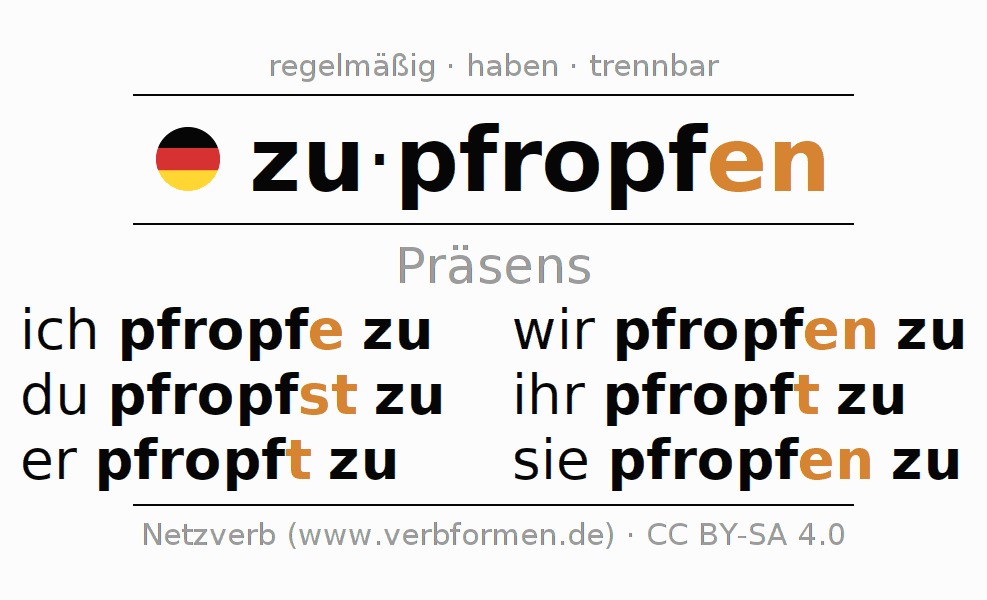 Das Verb zupfropfen vollständig in allen Personen und Numeri im Präsens Indikativ konjugiert