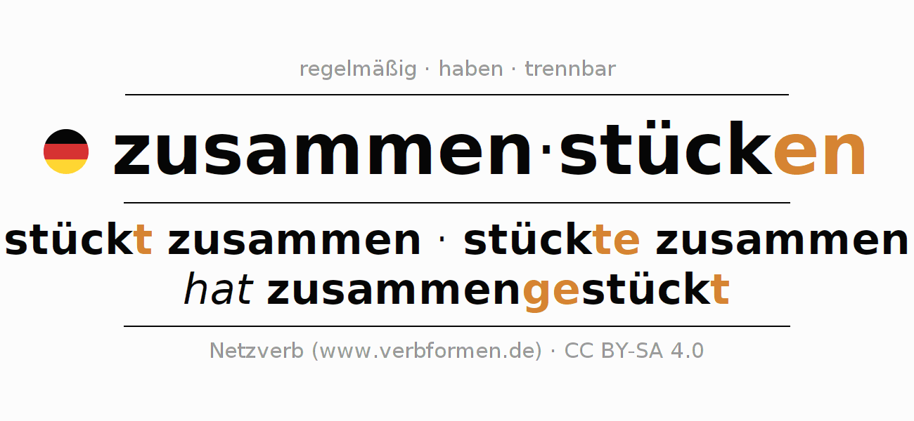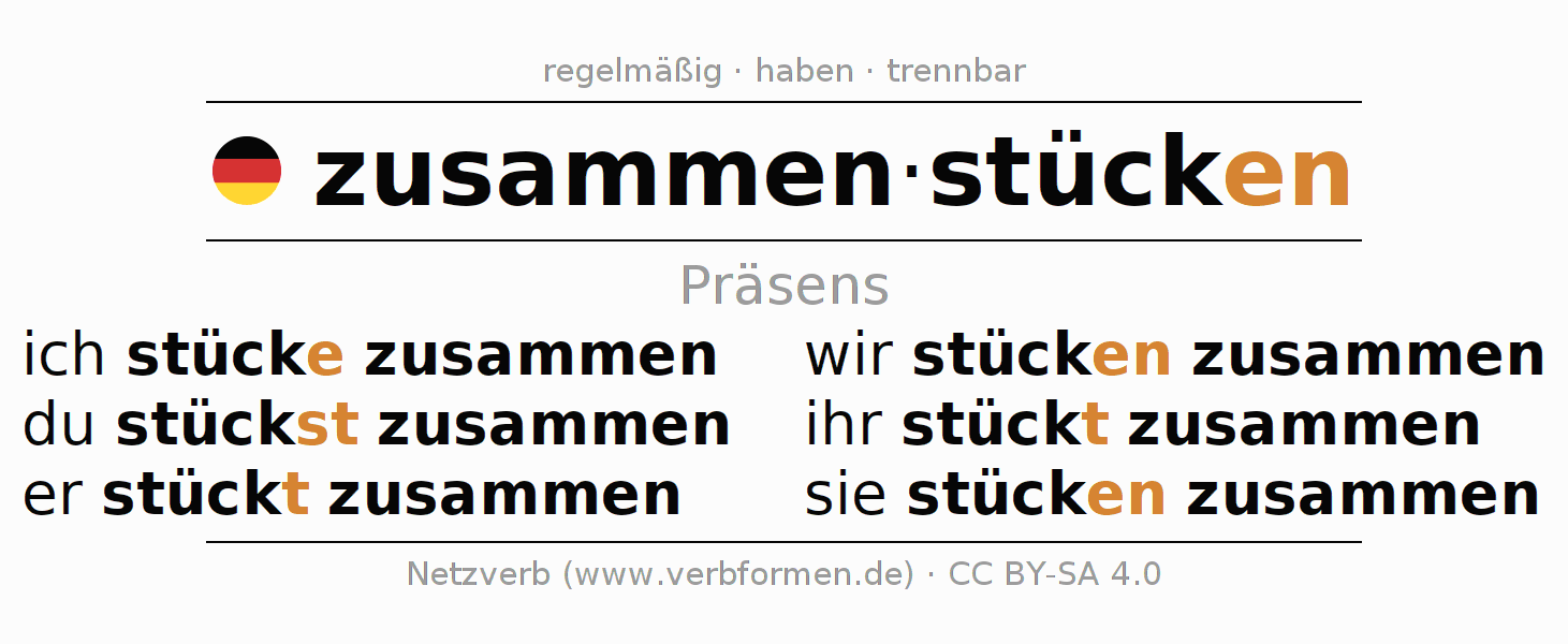 Das Verb zusammenstücken vollständig in allen Personen und Numeri im Präsens Indikativ konjugiert