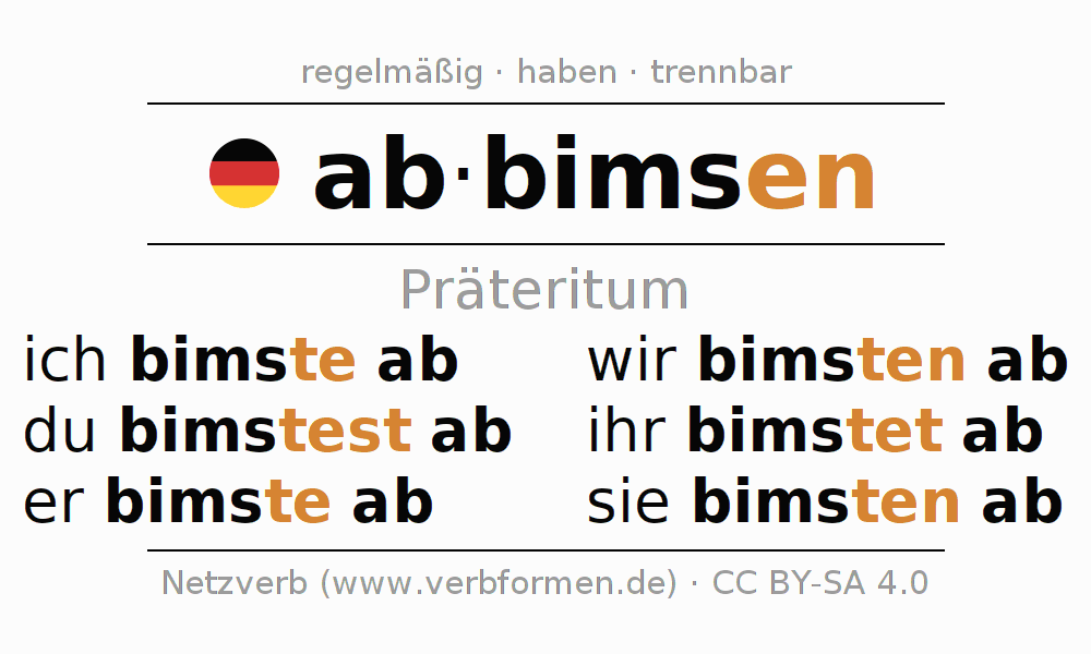 Das Verb abbimsen vollständig in allen Personen und Numeri im Präteritum Indikativ konjugiert