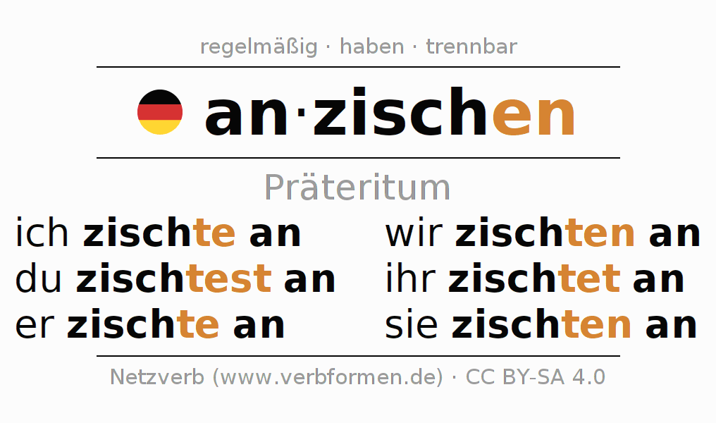 Das Verb anzischen vollständig in allen Personen und Numeri im Präteritum Indikativ konjugiert