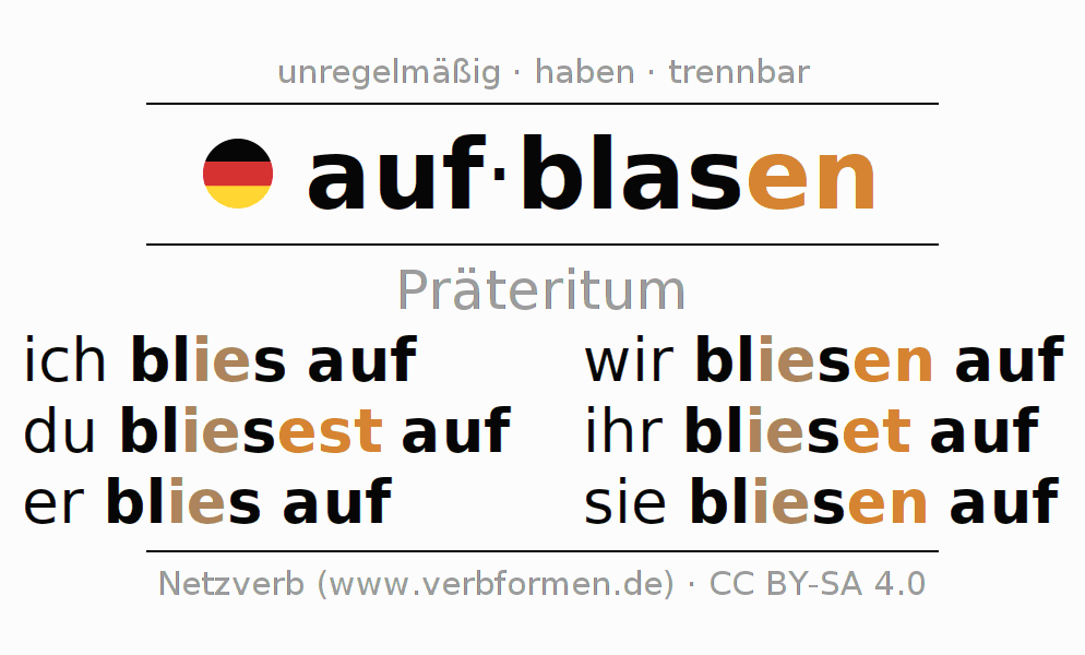 Das Verb aufblasen vollständig in allen Personen und Numeri im Präteritum Indikativ konjugiert