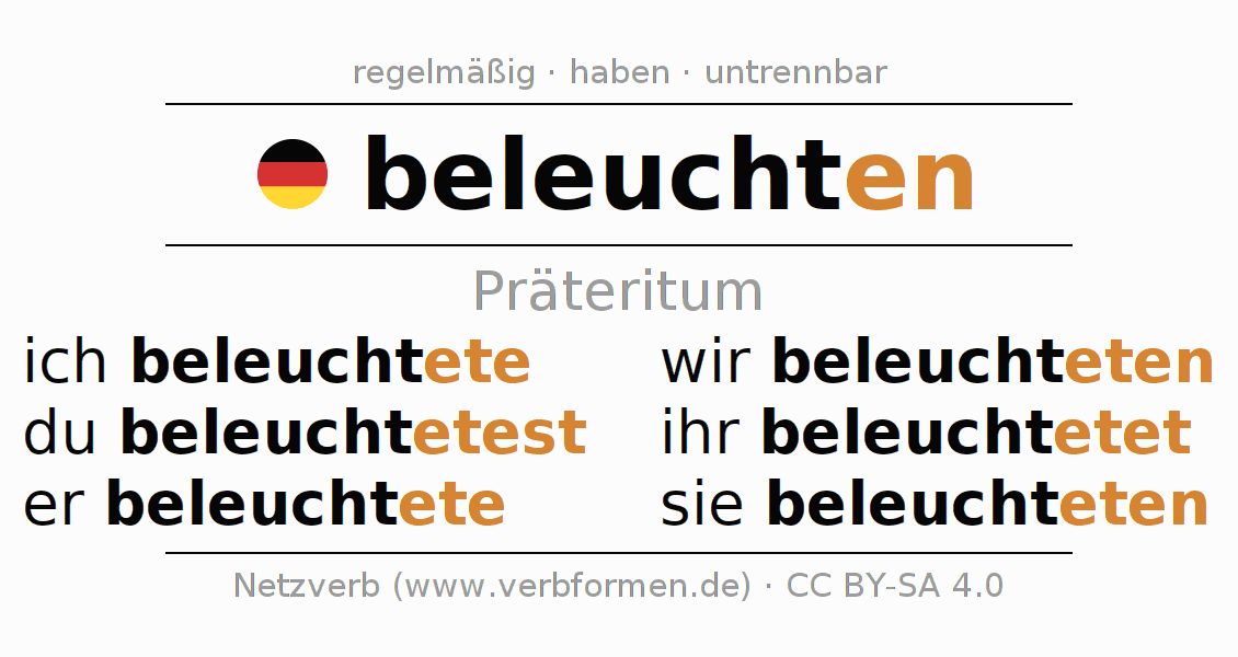 Das Verb beleuchten vollständig in allen Personen und Numeri im Präteritum Indikativ konjugiert