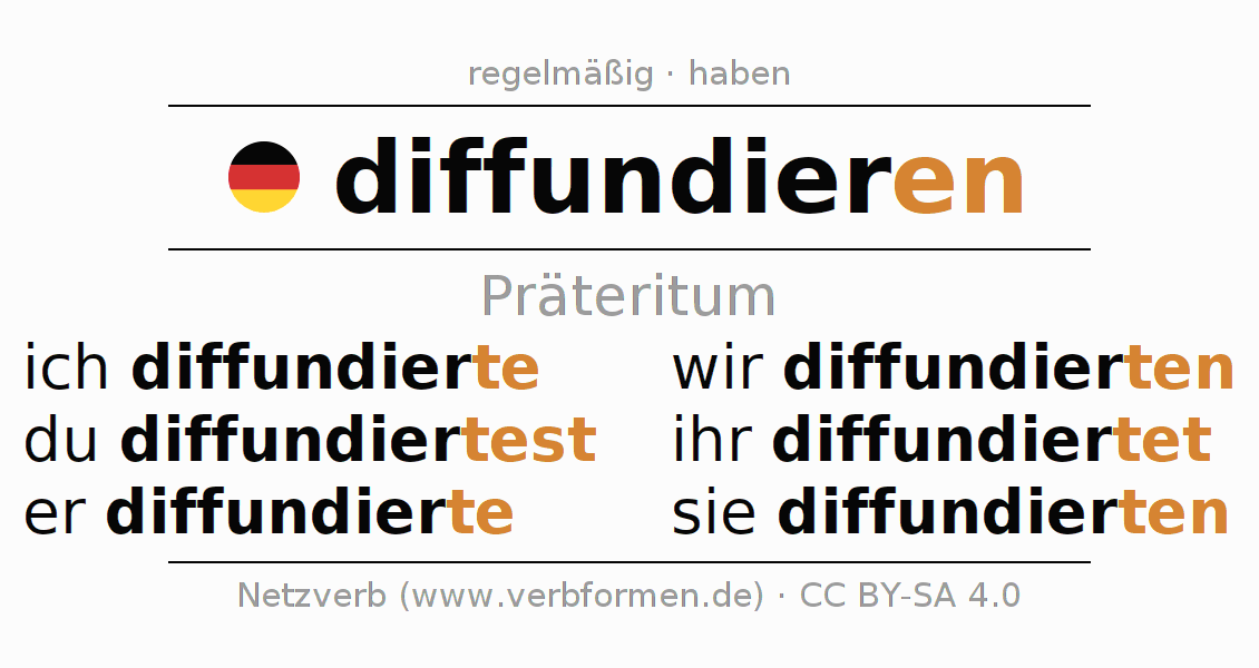 Das Verb diffundieren (hat) vollständig in allen Personen und Numeri im Präteritum Indikativ konjugiert