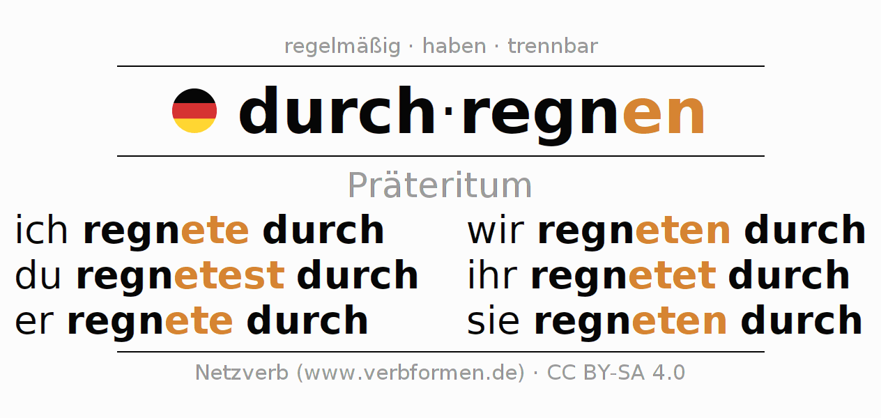 Das Verb durchregnen vollständig in allen Personen und Numeri im Präteritum Indikativ konjugiert