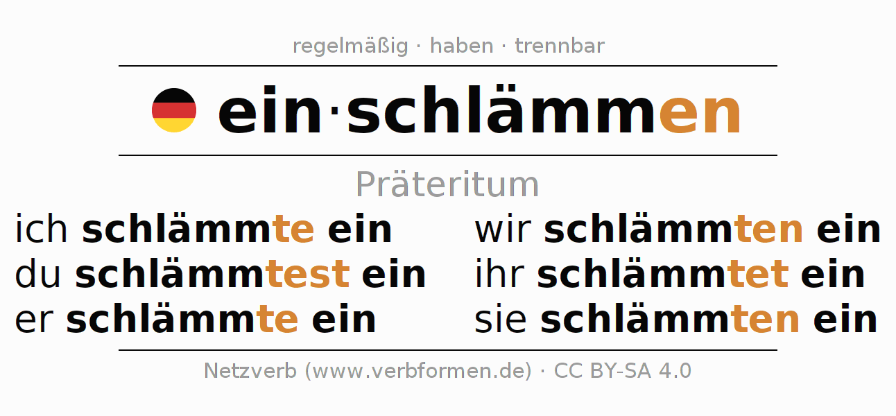 Das Verb einschlämmen vollständig in allen Personen und Numeri im Präteritum Indikativ konjugiert