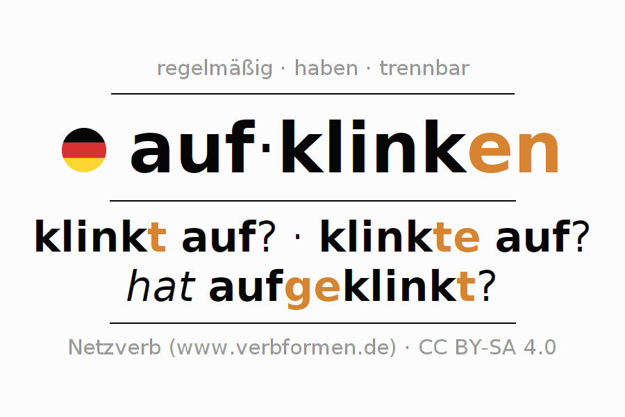 Die Konjugation von aufklinken im Präteritum Indikativ Vergangenheit Aktiv ist: klinkte ich auf?, klinktest du auf?, klinkte er auf?, klinkten wir auf?, klinktet ihr auf?, klinkten sie auf?.Die Bildung dieser Formen entspricht gewissen grammatischen Regeln. So auch die Vorgaben zur Konjugation der einfachen Verbformen von aufklinken im Präteritum. Kommentare ☆