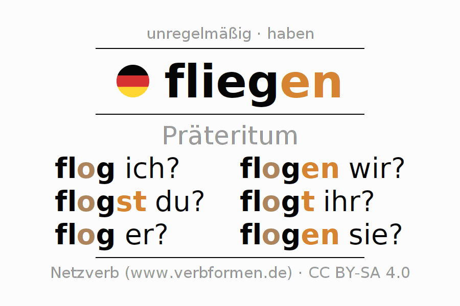 Das Verb fliegen (hat) vollständig in allen Personen und Numeri im Präteritum Indikativ konjugiert