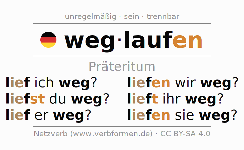 Das Verb weglaufen vollständig in allen Personen und Numeri im Präteritum Indikativ konjugiert