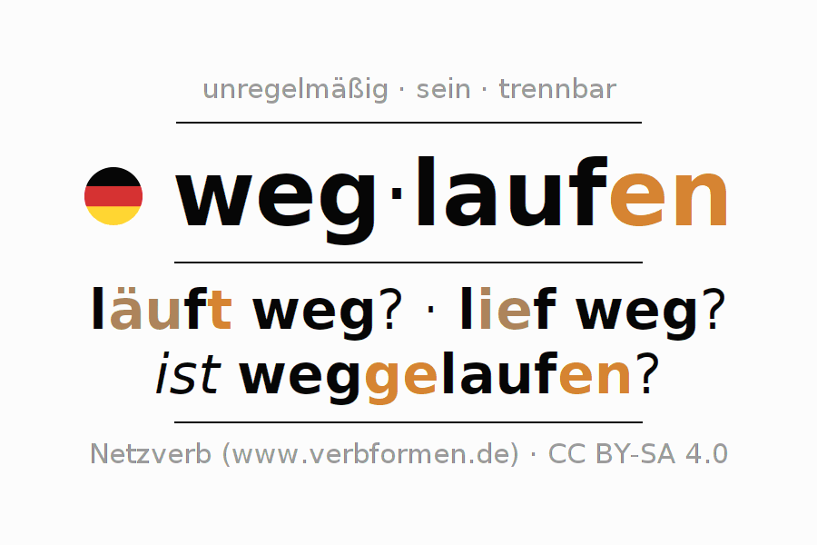 Die Konjugation von weglaufen im Präteritum Indikativ Vergangenheit Aktiv ist: lief ich weg?, liefst du weg?, lief er weg?, liefen wir weg?, lieft ihr weg?, liefen sie weg?.Die Bildung dieser Formen entspricht gewissen grammatischen Regeln. So auch die Vorgaben zur Konjugation der einfachen Verbformen von weglaufen im Präteritum. Kommentare ☆