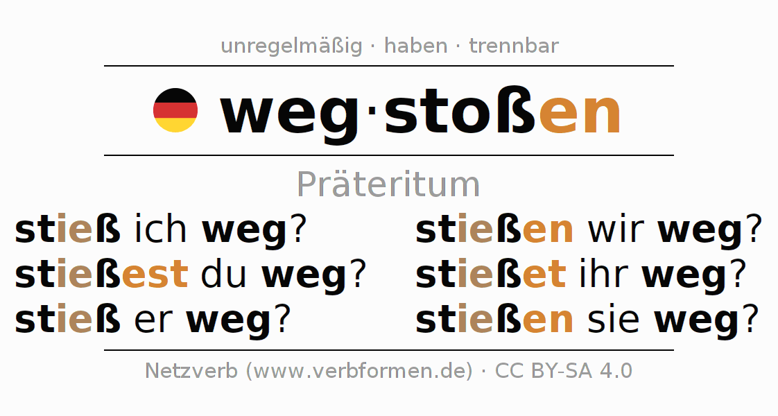 Das Verb wegstoßen vollständig in allen Personen und Numeri im Präteritum Indikativ konjugiert