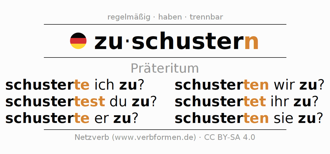 Das Verb zuschustern vollständig in allen Personen und Numeri im Präteritum Indikativ konjugiert