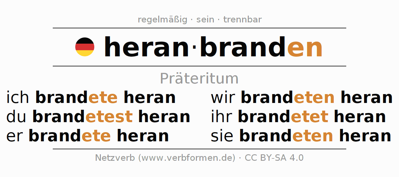 Das Verb heranbranden vollständig in allen Personen und Numeri im Präteritum Indikativ konjugiert