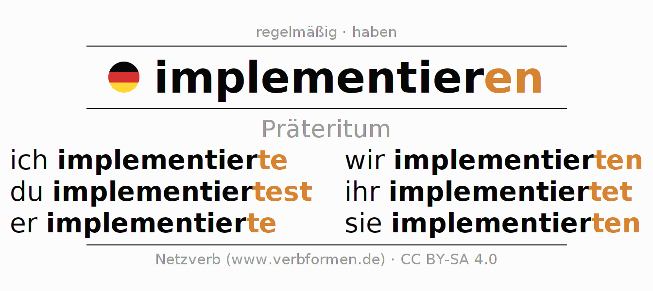 Das Verb implementieren vollständig in allen Personen und Numeri im Präteritum Indikativ konjugiert