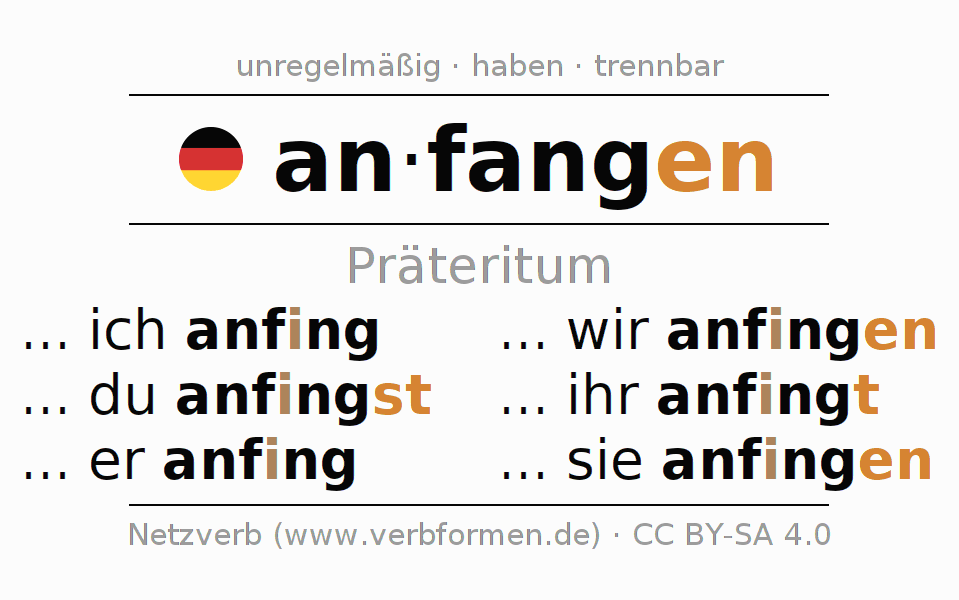 Das Verb anfangen vollständig in allen Personen und Numeri im Präteritum Indikativ konjugiert