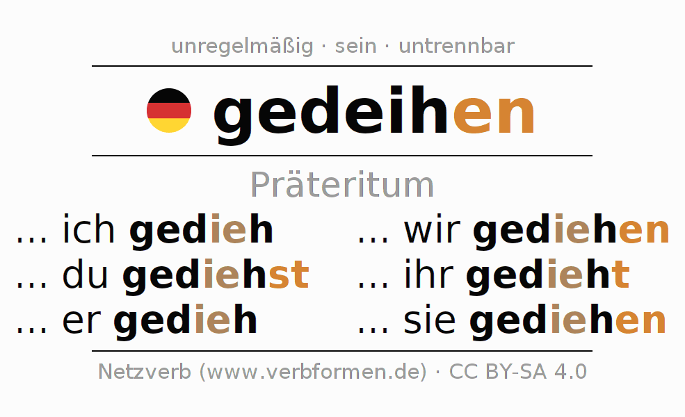Das Verb gedeihen vollständig in allen Personen und Numeri im Präteritum Indikativ konjugiert
