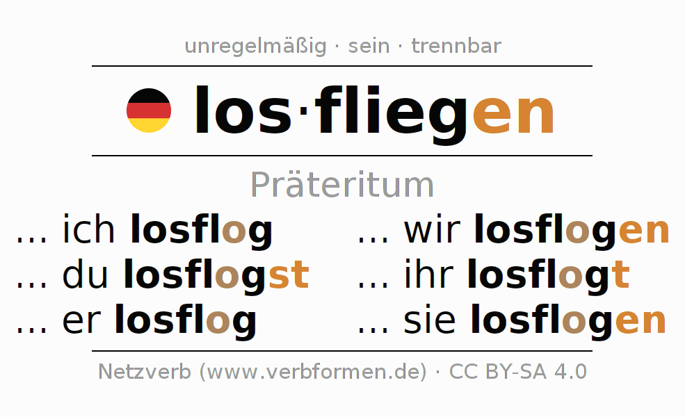 Das Verb losfliegen vollständig in allen Personen und Numeri im Präteritum Indikativ konjugiert
