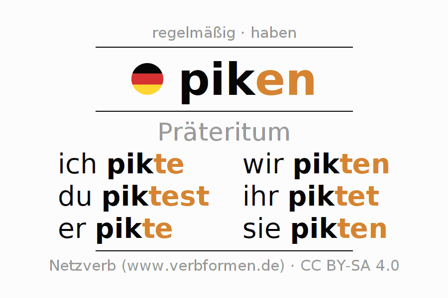 Das Verb piken vollständig in allen Personen und Numeri im Präteritum Indikativ konjugiert