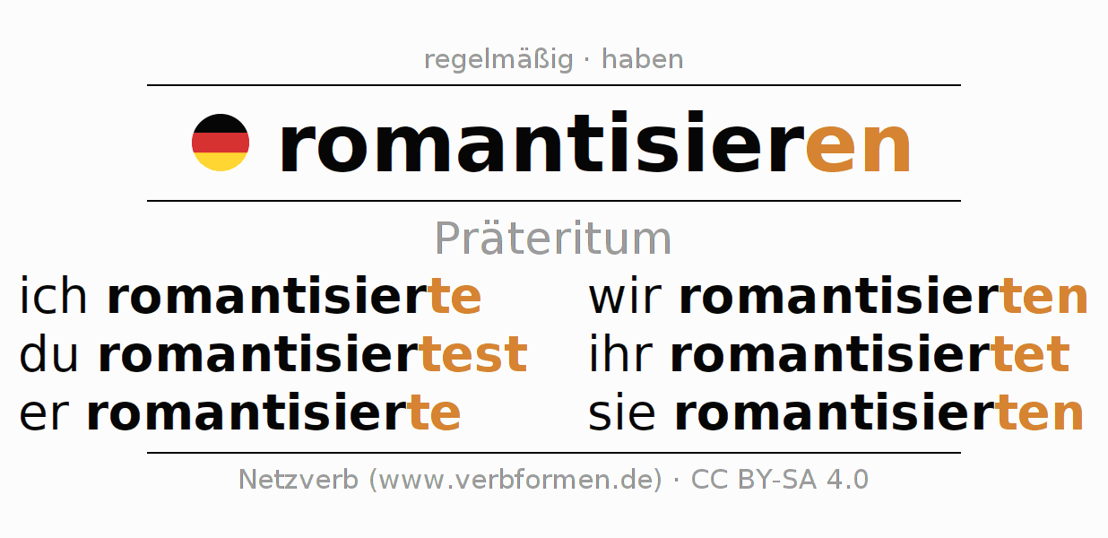 Das Verb romantisieren vollständig in allen Personen und Numeri im Präteritum Indikativ konjugiert