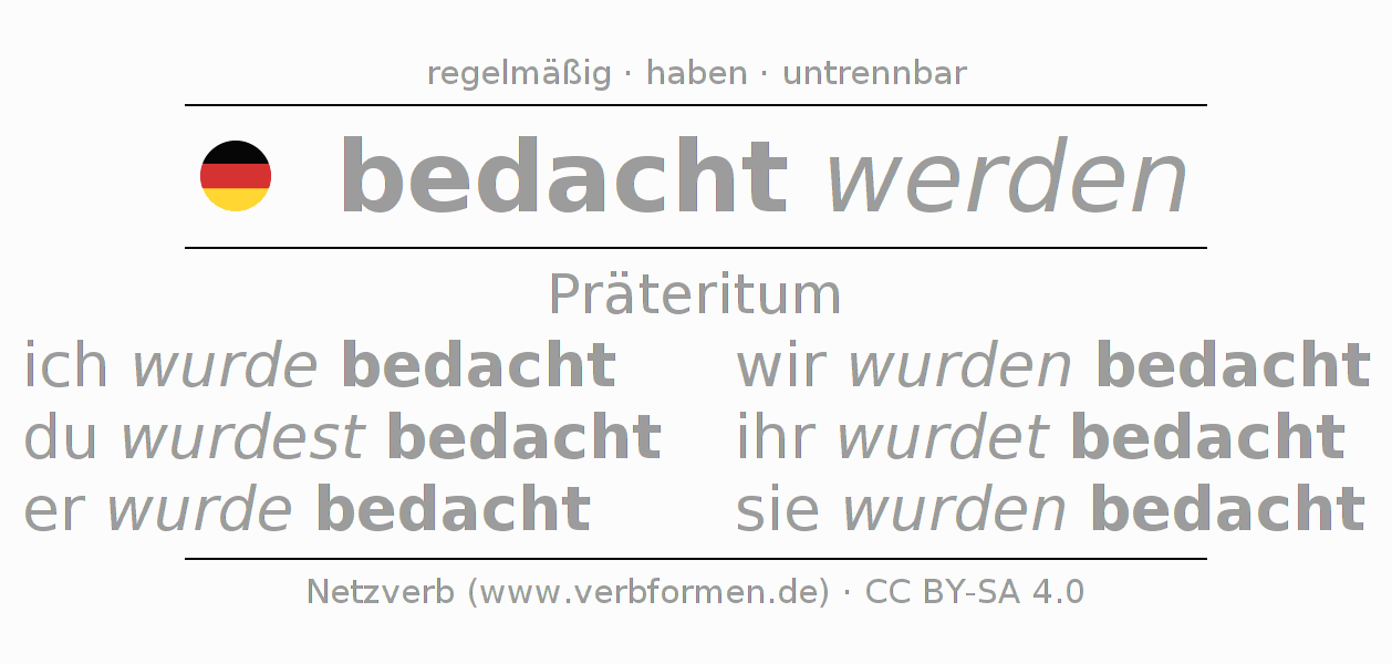 Das Verb bedachen vollständig in allen Personen und Numeri im Präteritum Indikativ konjugiert