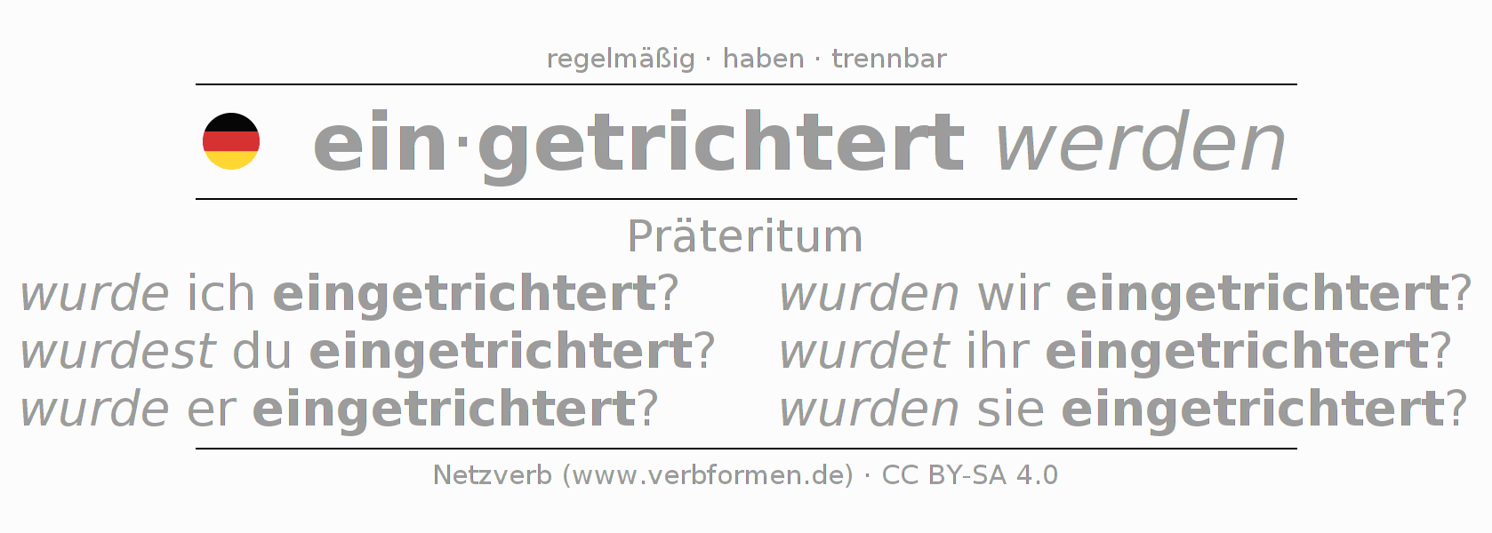 Die Konjugation von eintrichtern im Präteritum Indikativ Vergangenheit Vorgangspassiv ist: wurde ich eingetrichtert?, wurdest du eingetrichtert?, wurde er eingetrichtert?, wurden wir eingetrichtert?, wurdet ihr eingetrichtert?, wurden sie eingetrichtert?.Die Bildung dieser Formen entspricht gewissen grammatischen Regeln. So auch die Vorgaben zur Konjugation der einfachen Verbformen von eintrichtern im Präteritum. Kommentare ☆