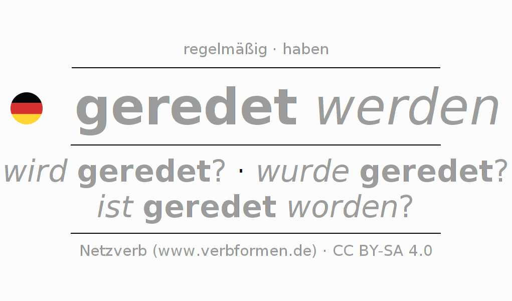 Die Konjugation von reden im Präteritum Indikativ Vergangenheit Vorgangspassiv ist: wurde ich geredet?, wurdest du geredet?, wurde er geredet?, wurden wir geredet?, wurdet ihr geredet?, wurden sie geredet?.Die Bildung dieser Formen entspricht gewissen grammatischen Regeln. So auch die Vorgaben zur Konjugation der einfachen Verbformen von reden im Präteritum. 3Kommentare ☆5.0