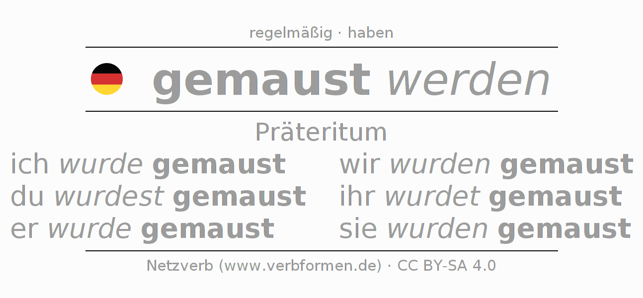 Die Konjugation von mausen im Präteritum Indikativ Vergangenheit Vorgangspassiv ist: ich wurde gemaust, du wurdest gemaust, er wurde gemaust, wir wurden gemaust, ihr wurdet gemaust, sie wurden gemaust.Die Bildung dieser Formen entspricht gewissen grammatischen Regeln. So auch die Vorgaben zur Konjugation der einfachen Verbformen von mausen im Präteritum. Kommentare ☆